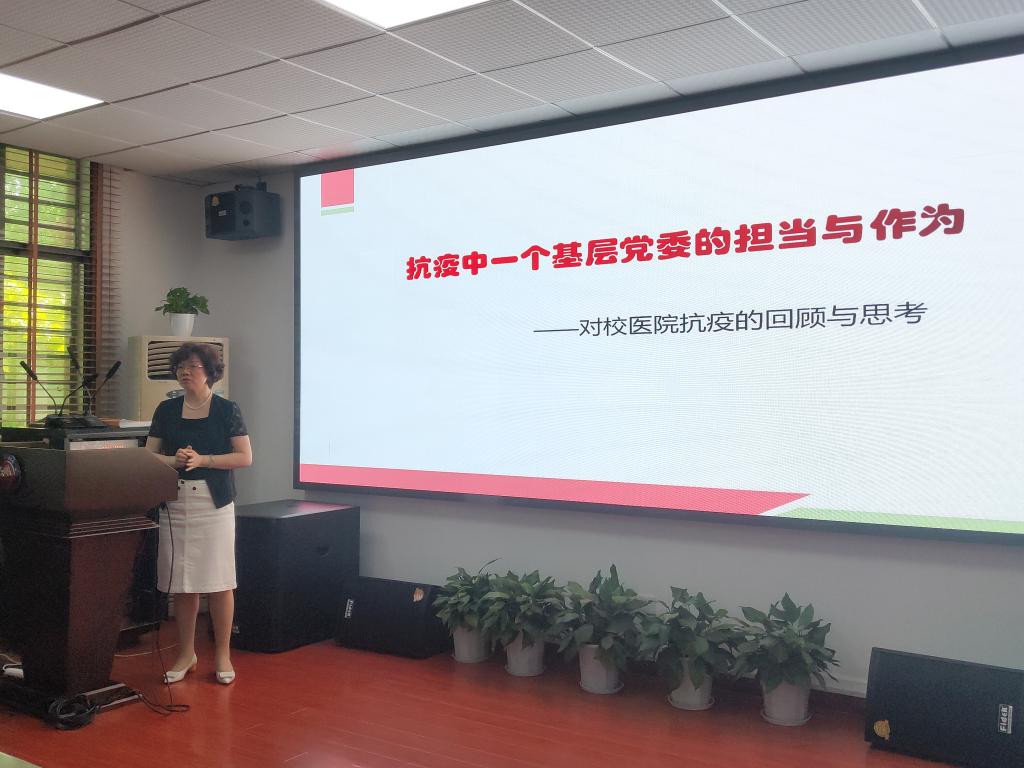 随后,我院党委书记李小红以自身经历为例讲述了武汉抗疫中华中科技大学校医院基层党委的担当。在过年期间,校医院部分出游的医生、护士听闻武汉疫情便毫不耽搁地回来帮忙,注射室的同志一天连值三班;当政府医疗资源紧缺时,校医院承包了四个隔离点,并为群众进行健康宣教和释疑解惑;当上百个发热病人不能出门检测时,校医院的同志们当起了家庭医生上门服务,并在技术员的帮助下通过线上问诊软件,为分布在全国各地的老师和同学问诊……在抗击疫情的关键时刻,校医院的党员同志始终坚守岗位,把危险、重担、困难留给自己,把安全让给别人,体现了身边基层共产党员的担当。