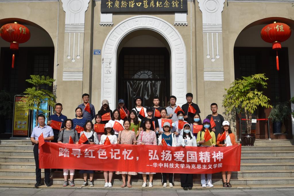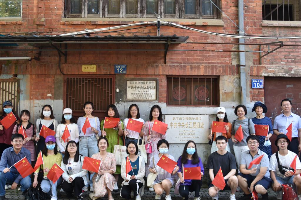 学院党委书记李小红,院长岳奎,院党委副书记、副院长王明飞和梁红、夏增民两位学院老师带领24名研究生,手持国旗,依次寻访了宋庆龄汉口故居、八七会议旧址、中共长江局旧址和中共中央机关旧址。