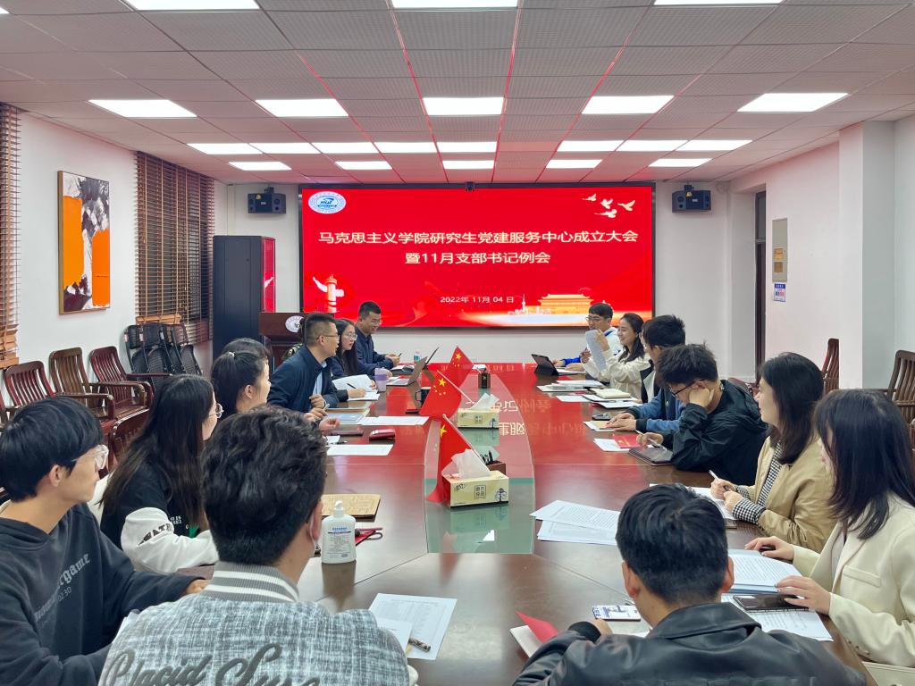 为更好引导马院青年以实际行动听党话、跟党走,促进研究生党支部更好地开展党建工作,11月4日下午马克思主义学院研究生党建服务中心成立大会于东七楼203会议室顺利举行。学院党委书记刘雅然,党委副书记、副院长王明飞,研究生辅导员王茜及各研究生党支部书记、院党务中心全体成员参会。会议由院党务中心负责人贾才鹏主持。