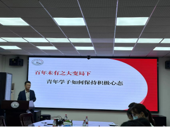 活动在雄壮的国歌声中拉开帷幕。活动伊始,王明飞副书记以《百年未有之大变局下青年学子如何保持积极心态》为题讲授主题党课。王明飞由“百年未有之大变局下马院学子的心态”入手,结合社会热点案例,深入浅出地讲解了当前社会心态特别是大学生的社会心态及如何调整等问题,倡导同志们通过广泛寻求外部支持、结交挚友、强健体魄和健康饮食等途径,在复杂多变的外部环境下保持积极健康的心态,以之更好地促进自身发展。