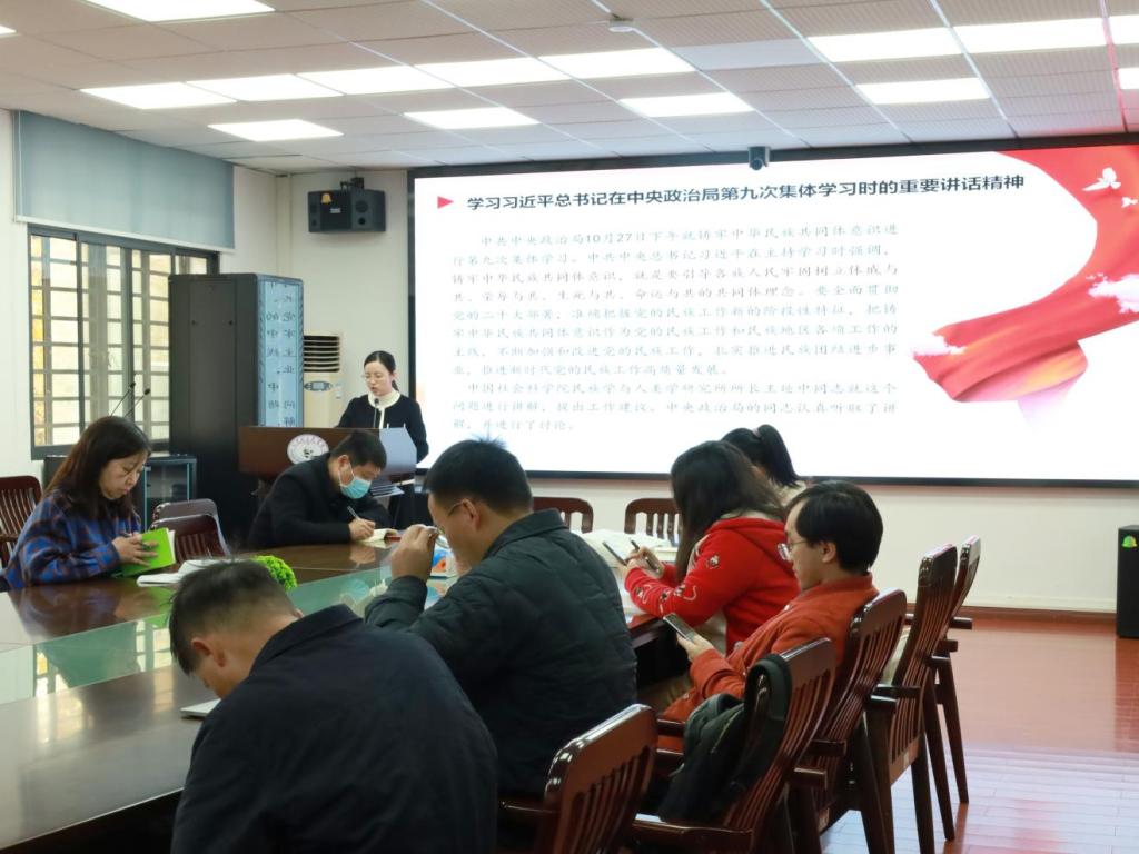 本次活动的第一项议程为学习习近平总书记重要讲话精神。首先,由邹旭怡老师领学习近平总书记在中央政治局第九次集体学习时的重要讲话精神。10月27日,中共中央政治局就铸牢中华民族共同体意识进行第九次集体学习,习近平总书记发表重要讲话。邹旭怡从集体学习的概况,铸牢中华民族共同体意识的重大意义、重要任务、工作要求,推动铸牢中华民族共同体意识教育与思政课教学等方面分享了学习体会。随后,由张冬静老师领学习近平总书记在第三届“一带一路”国际合作高峰论坛开幕式上的主旨演讲精神。10月18日,习近平总书记出席第三届“一带一路”国际合作高峰论坛开幕式并发表主旨演讲。张冬静梳理了共建“一带一路”重大倡议提出10年来取得的丰硕成果,中国支持高质量共建“一带一路”的八项行动,以及未来的美好愿景和前进方向。与会党员就以上内容分享了自己的学习体会,并且结合教学科研育人工作,进行了深入交流。