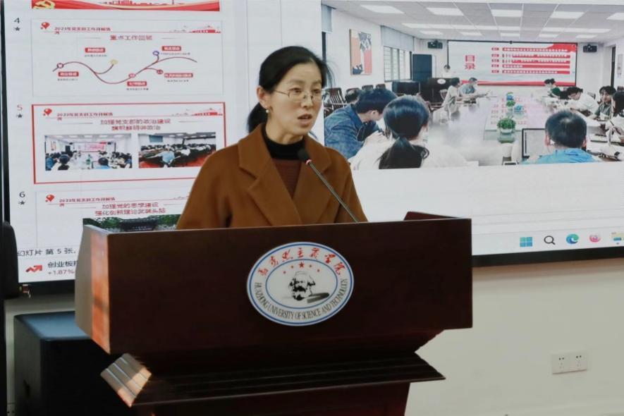 “马原-科哲”联合党支部书记熊文娴从政治建设、思想建设、纪律建设、制度建设、作风建设、组织建设六个维度入手,对支部重点工作开展情况及成效进行了年度回顾,随后从标杆树立、群众工作、“双融合”效度等方面进行了问题反思,并对下一阶段党支部的党建工作作出展望。