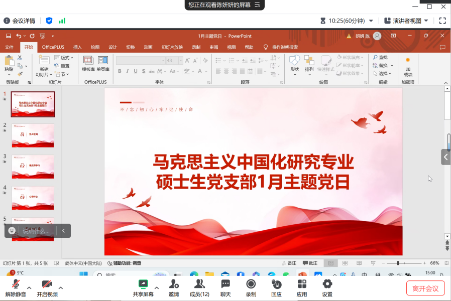 (通讯员:赵姗琳)为强化党员使命担当,提升支部组织活力,促进党员间的交流与合作,1月25日,马克思主义中国化研究专业硕士生党支部于线上开展一月党日活动,党支部成员参会进行理论学习,会议由党支部副书记陈妍妍同志主持。