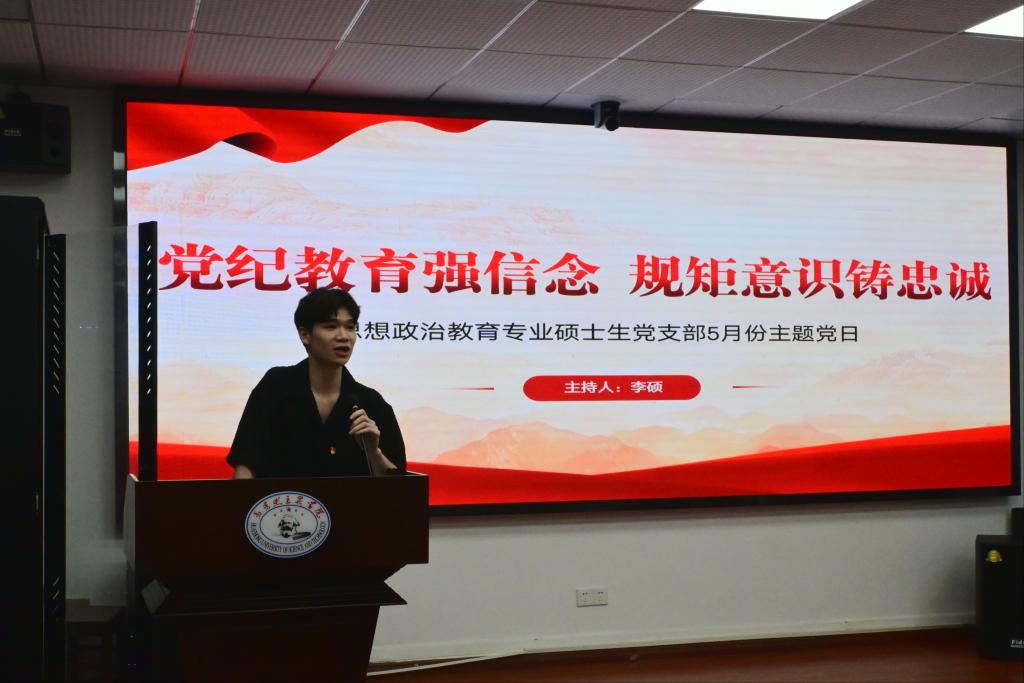 (通讯员:刘孟迪)5月23日晚,马克思主义学院思想政治教育专业硕士生党支部五月党日活动在东七楼203会议室举行。为贯彻中共中央办公厅《关于在全党开展党纪学习教育的通知》,支部本月党日活动以“党纪教育强信念,规矩意识铸忠诚”为主题进行集体学习,活动由支部组织委员李硕主持。