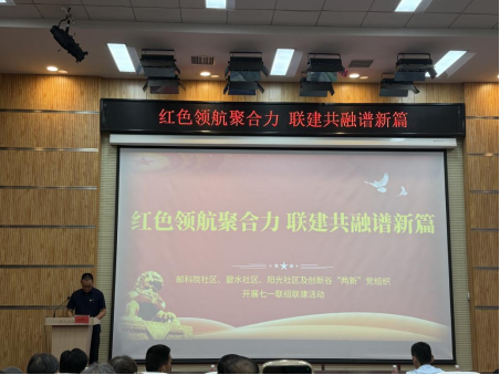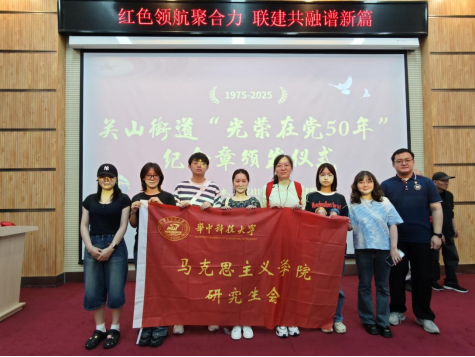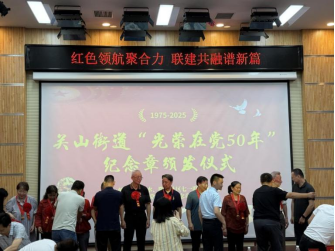 在七一建党节即将到来之际,为进一步增强党组织的凝聚力与向心力,弘扬党的光荣传统,2025年6月24日上午,华中科技大学马克思主义学院联合碧水社区、邮科院社区、阳光社区在烽火创新谷报告厅开展“七一联组联建暨‘光荣在党50年’纪念章颁发活动”。关山街道副主任耿飞,关山街道党政办公室主任欧德元、黄自刚,碧水社区、邮科院社区、阳光社区各支部书记、副书记,关山街道“光荣在党50年”党员,烽火创新谷综合党委成员,武汉风韵出行信息科技有限公司党委成员以及我院8名志愿者同学参加本次活动。