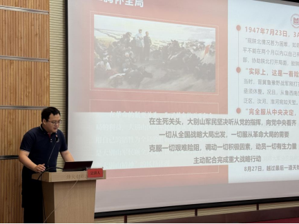 活动最后,我院硕士研究生、校研究生红色理论学讲团讲师杨一博以《28年红旗不倒:伟大的大别山精神》为主题向与会成员讲授了专题党课。杨一博深入浅出地阐述了大别山精神的深刻内涵,并结合新时代要求进行了生动的解读。这堂党课如同一场精神的洗礼,让大家深刻感悟到革命先辈的坚定信仰和不屈斗志,从中汲取了强大的精神动力。