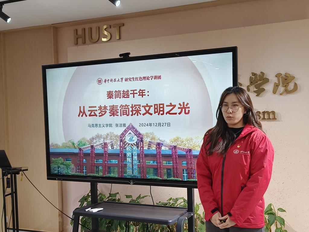 活动伊始,研究生红色理论学讲团讲师张洁雅以《秦简越千年:从云梦秦简探文明之光》为题,从习近平总书记在湖北考察时的重要讲话精神为切入点,细致讲解了云梦秦简中具有代表性的作品,并从两个结合的层面论述了云梦秦简所具有的现代价值,呼吁同学们体会云梦秦简的文化价值,学习其中的法制精神与和平理念,为实现中国式现代化贡献自己的一份智慧。
