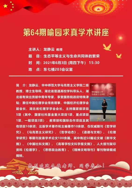 学术报告通知:由党建研究所和马克思主义中国化研究所联合承办的第64期喻园求真学术讲座于6月3日(本周四)15:30在学院203大会议室举行,欢迎大家参加。