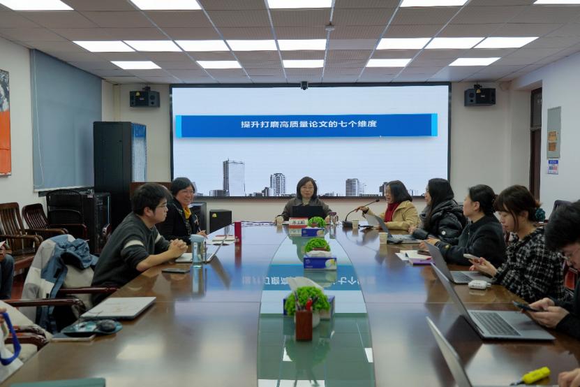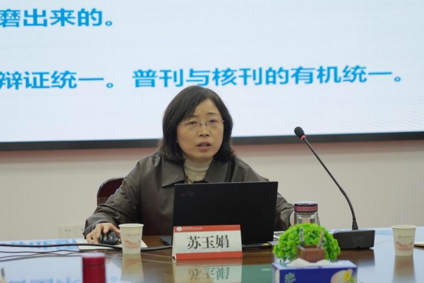 随后,苏玉娟以《提升打磨高质量论文的七个维度》为题展开分享交流。她结合自身科研经历,从七个维度系统阐述了撰写高质量论文的方法。首先,她强调了选题的重要性,呼吁大家树立正确的问题观,善于发现真问题,在关注学术动态的同时关注社会实践的需要,做到选题既有新意又有深度。其次,她指出在论文写作时要有科学的结构观以及与时俱进的时空观,确保论文逻辑清晰,兼具历史思维、发展思维、世界思维以及辩证思维。再次,她认为撰写出优秀论文还需作者具备厚实的文字观与严格的学术观。她结合实际案例,向在场师生细致传授了打磨文章的方法,并着重阐述了五个关键步骤:把好政治观、规范使用学术语言、规范引用参考文献、精准把握期刊特色、严格控制复制比。最后,苏玉娟针对人工智能时代ai写作技术广泛应用的现状,向与会者提出了树立理性技术观的建议。她强调,在充分利用AI作为高效辅助工具的同时,应继续发挥人类创造力的核心价值,避免陷入过度依赖的境地;在享受技术便利的同时,更要坚守对学术研究与创作的热情与执着,确保学术成果的质量与深度。