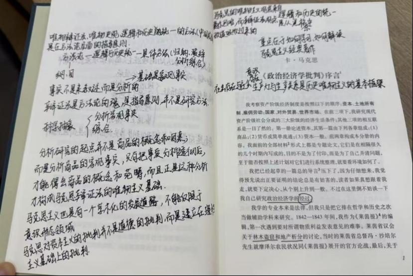 活动伊始,杨成林强调学习和理解马克思主义著作必需秉持严谨的学术态度,形成批判性思维。他围绕马克思主义方法论展开论述,深入浅出地探讨了方法论的三个层面:唯物辩证法和唯物史观、具体分析和综合方法,以及逻辑和历史的统一作为连接方法论和具体方法的中间层面。进而指出,对于客观事实的分析是构成马克思主义辩证法的唯物主义基础。在导读序言前,杨成林简要介绍了马克思本人的成长背景,分析了马克思的精神特征及其早期思想的形成过程和影响因素。接着,他详细分析了《政治经济学批判》的内容结构,指出“资本”是一定阶级和利益关系的体现,政治经济学研究的核心是阶级利益关系,而非单纯的物质工具或生产过程。最后,他带领同学们着重探讨了马克思主义经济学中关于抽象与具体的分析方法,即如何通过从个别到一般,再从一般到个别的过程来理解经济现象,指出劳动、资本等概念在不同历史时期和经济关系中存在意义变化,在具体分析过程中要做到逻辑与历史的统一。杨成林旁征博引,结合具体案例对马克思经典著作进行了深入的研读,与会众人都表示受益匪浅。