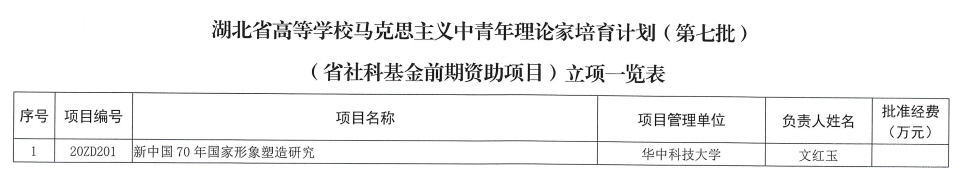 我院文红玉教授《新中国70年国家形象塑造研究》入选湖北省高等学校马克思主义中青年理论家培育计划(第七批)(省社科基金前期资助项目)。