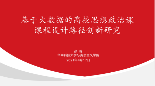 会上,张峰教授指出,大数据时代的到来不仅引发了各行各业的巨大变革,同时也势必会对高校思想政治课的发展产生重大影响,将大数据运用与思政课课程的特点相结合是大势所趋。张峰教授以大数据时代为研究背景,从大数据思政课堂的意蕴、大数据在思政课堂中运用的步骤、大数据挖掘方法在思政课教学的运用以及基于大数据的思政课堂的可视化分析四个维度对大数据在思政课程中的运用进行了详细阐述。