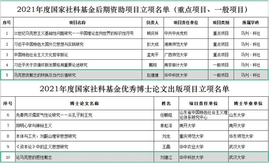 10月8日,全国哲学社会科学工作办公室公示2021年度国家社科基金后期资助暨优秀博士论文出版项目立项名单,我院青年教师赵建建申报的《马克思类概念的转换及当代价值研究》获后期资助项目立项,青年教师刘建江申报的《论马克思的感性概念》获优秀博士论文出版项目立项。