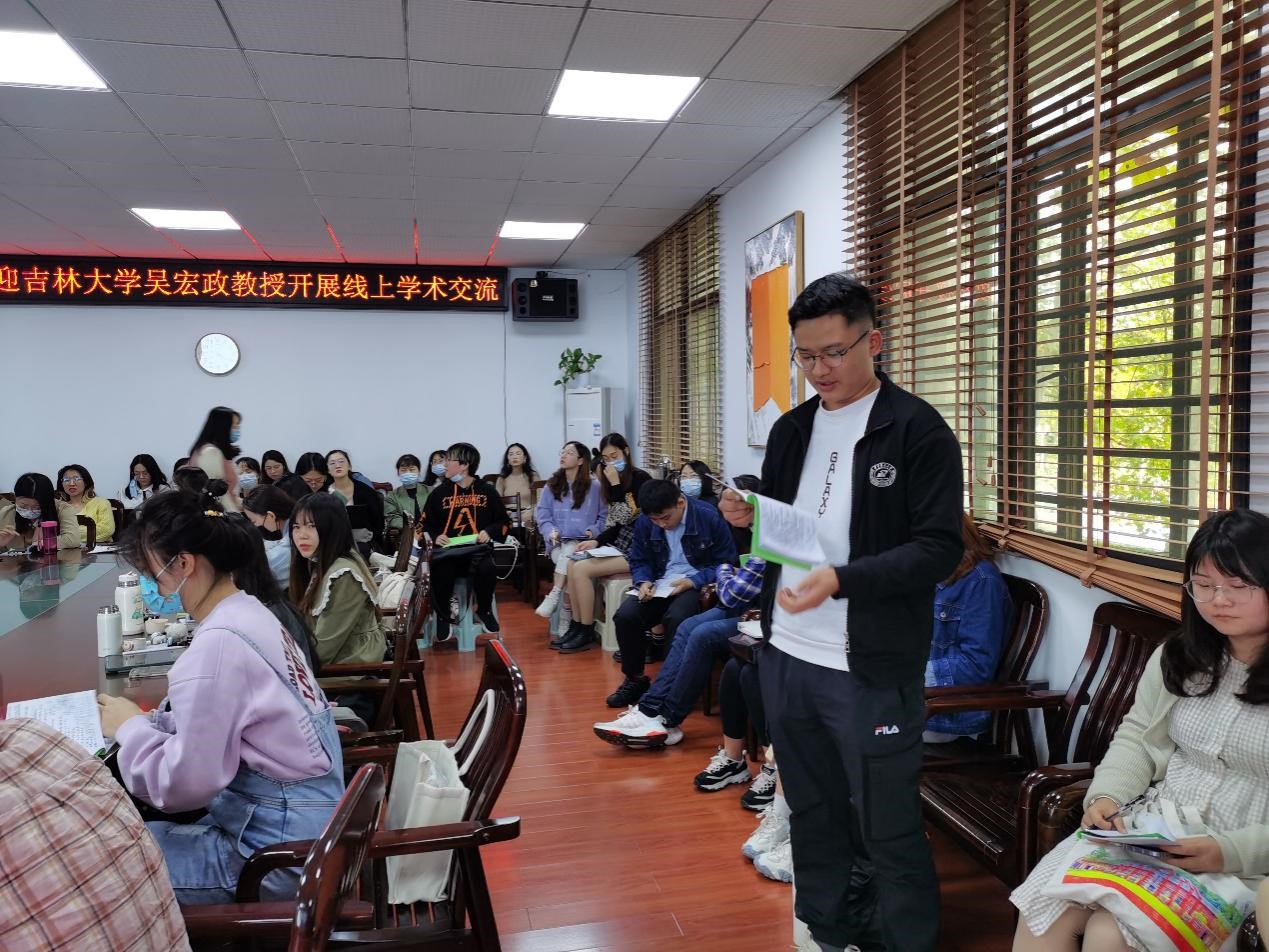 在交流提问环节,同学们与吴宏政教授讨论了有关“人类命运共同体”的话题,吴宏政教授表示,“推动构建人类命运共同体”是21世纪马克思主义世界历史观的叙事主题,和马克思的普遍价值一致,要创造有差异的利益共同体,创造共同体的共同价值。