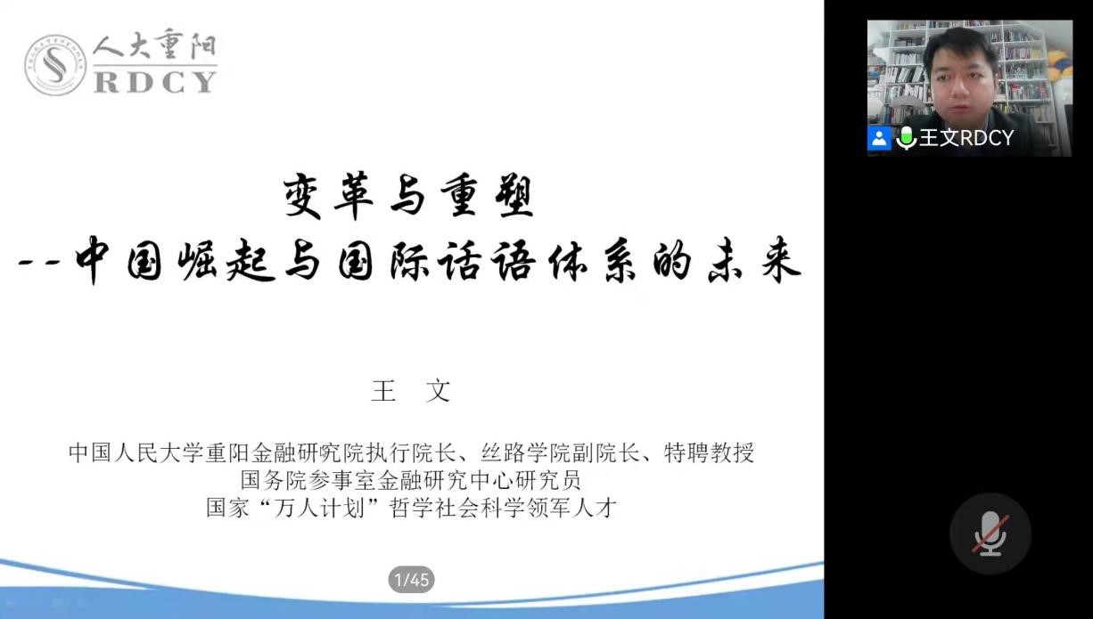 11月20日晚19:00,中国人民大学重阳金融研究院执行院长、丝路学院副院长、特聘教授,国务院参事室金融研究中心研究员王文教授在线上为我院师生作了题为“变革与重塑——中国崛起与国际话语体系的未来”的学术讲座。此次讲座为习近平外交思想系列专题讲座,由杜志章教授主持,学院教师代表、博士生、硕士生于梧桐语问学中心明德报告厅聆听讲座,同时还有来自全国各地的师生通过线上会议参与其中。