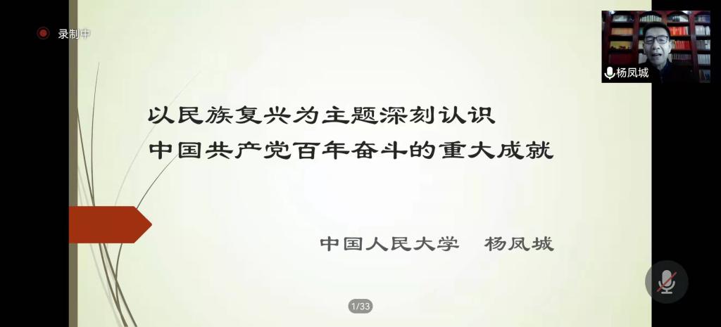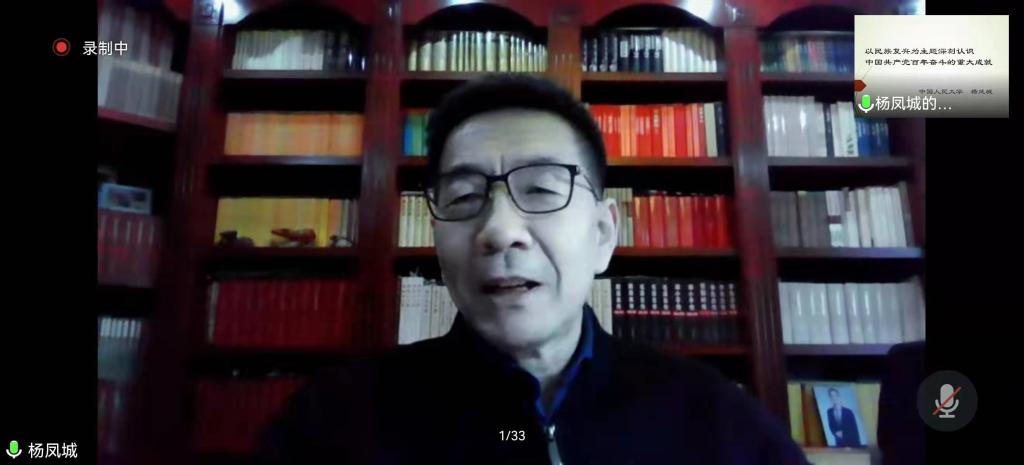 12月30日下午,第86期喻园求真学术讲座于线上顺利举办,中国人民大学马克思主义学院杨凤城教授应邀作了题为“以民族复兴为主题深刻认识中国共产党百年奋斗的重大成就”的学术讲座。马克思主义学院教师代表、研究生在东七楼207会议室集中聆听,来自全国各地的数百名师生通过线上方式参与讲座,学院党委书记李小红主持本次讲座。