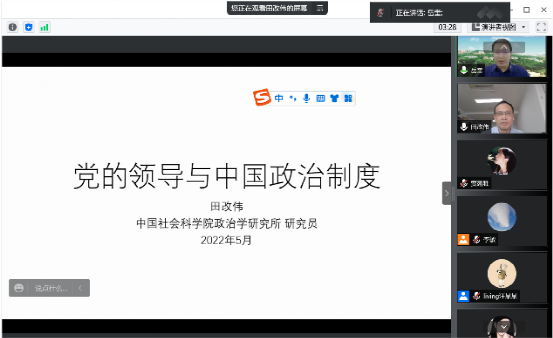 5月31日下午,第92期喻园求真讲座于线上顺利举办。中国社会科学院政治学研究所马克思主义政治学研究室(中心)主任、研究员田改伟教授应邀为我院师生作题为“党的领导与中国政治制度”的讲座。我院数百名师生通过线上方式参与,院长岳奎担任本次讲座主持人。