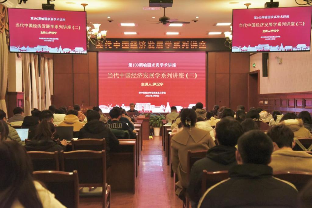 3月1日晚,第100期喻园求真学术讲座在华中科技大学梧桐语问道厅成功举办。湖北省委原常委、省委宣传部原部长、全国哲学社会科学规划领导小组原副组长尹汉宁应邀为我院师生作题为《当代中国经济发展学》的学术讲座。湖北省社科联党组书记、常务副主席喻立平,马克思主义学院党委书记刘雅然,党委副书记、副院长王明飞及学院师生参加讲座。讲座由马克思主义学院院长岳奎主持。