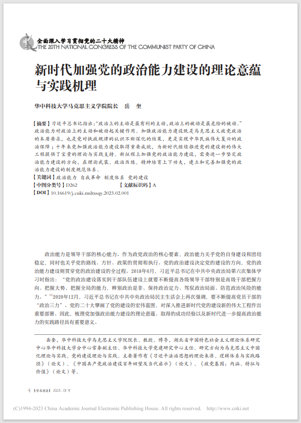 《人民论坛·学术前沿》 2023年第2期(1月下)刊发了我院岳奎教授的学术论文《新时代加强党的政治能力建设的理论意蕴与实践机理》。