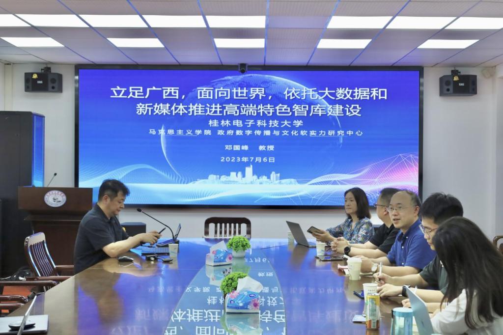讲座伊始,邓国峰就桂林电子科技大学政府数字传播与文化软实力研究中心团队的缘起与发展脉络、智库理论研究的平台搭建、智库建设的方向与成果等方面进行介绍。他表示,研究中心以互联网、新媒体、大数据为依托,以“立足广西,面向世界,全面服务区内外意识形态”为发展目标,聚焦网络舆情、社会安全稳定和意识形态、社会主义核心价值观传播等领域,从技术开发、新媒体虚拟现实、舆情分析预警、数字智库四个板块着手开展了一系列相关研究。
