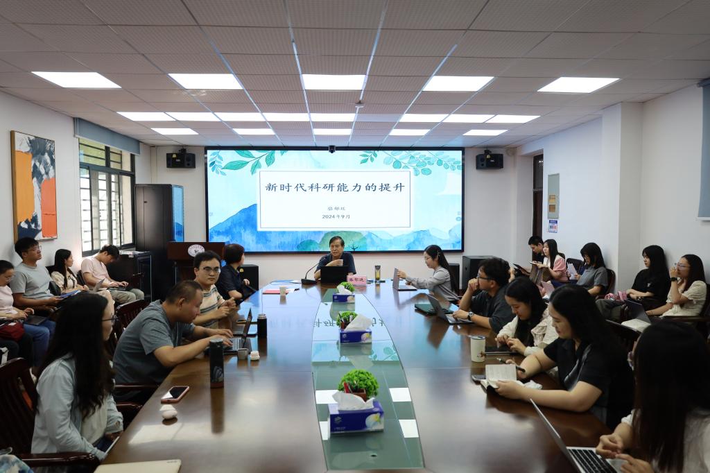 随后,骆郁廷教授以《新时代科研能力的提升》为题进行分享交流。他围绕学科建设、前沿问题、科研创新、严谨治学四个方面展开了精彩讲授。第一,要以学科建设为龙头。在从事学术研究时,学者应当具备清晰的学科意识,锚定研究方向和研究领域,重视学术积淀,从而更好发挥自身优势。第二,要以前沿问题为导向。他深入分析了科研的内容和形式,鼓励在场师生加强学术调研,紧跟主流前沿,把握科研实质。第三,要坚持以科研创新为动力。学者要将个人创新与团队创新相结合、题目创新与内容创新相结合,不断深化原创性研究、集成性研究、转化性研究、阐释性研究和开发性研究。第四,要坚持以严谨治学为遵循。他阐述了严谨对于科研的重要性,强调论文写作一定要精选题目、深刻论证、逻辑严谨、文笔流畅。最后,骆郁廷教授勉励全体师生要始终保持对学术的热爱,脚踏实地,刻苦钻研,不断提升自身科研能力,取得新的有价值的科研成果,为马克思主义理论研究贡献力量。
