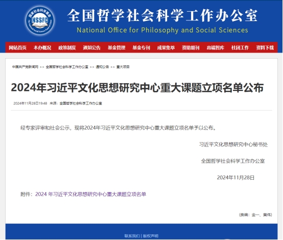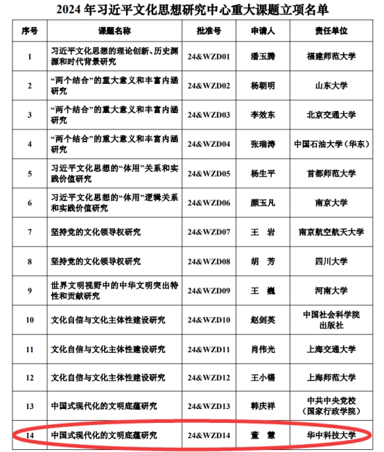 近日,全国哲学社会科学工作办公室公布了2024年习近平文化思想研究中心重大课题立项名单,我院董慧教授获得立项资助。