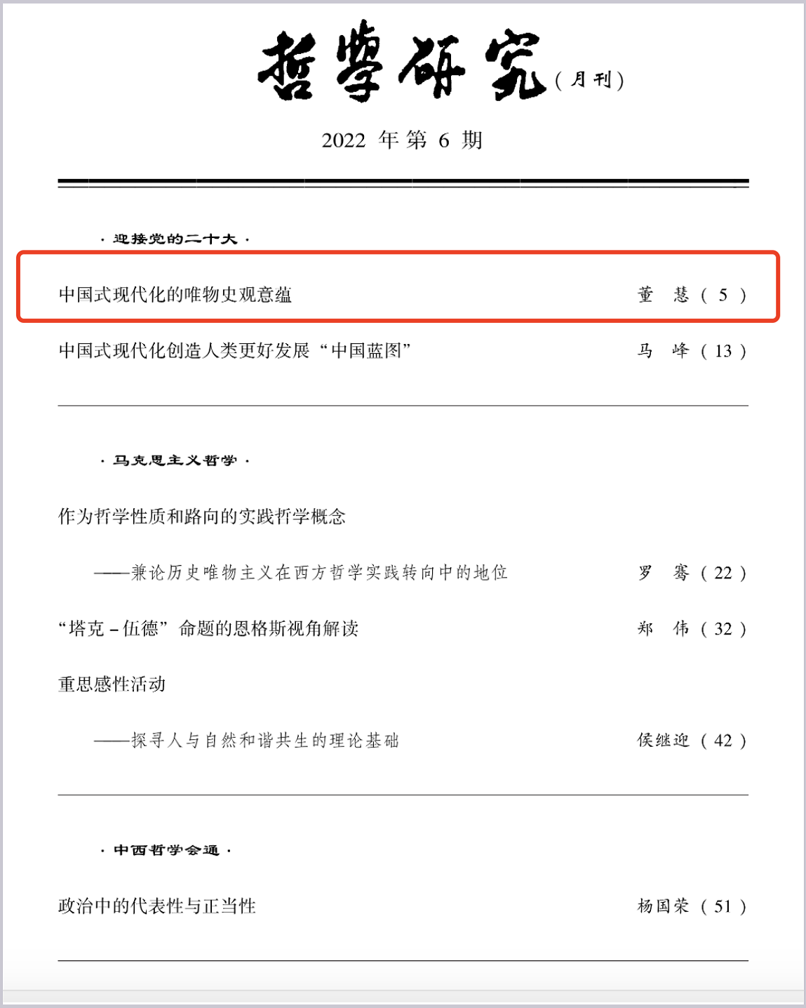 《哲学研究》2022年第6期封面首篇文章刊发我院董慧教授学术论文《中国式现代化的唯物史观意蕴》。该文系2021年度教育部哲学社会科学研究重大课题攻关项目“中国共产党领导下中国现代化道路探索历程与经验研究”的阶段性成果;受2022年“华中科技大学文科双一流建设项目基金(马克思主义基础理论及其创新发展研究)”资助。