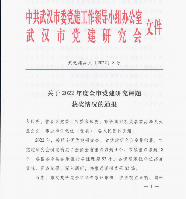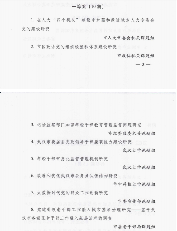 中共武汉市委党建工作领导小组办公室等联合发布《关于2022年度全市党建研究课题获奖情况的通报》,对全市党建研究课题优秀成果进行表彰,我院岳奎教授主持完成的政策报告《改善和优化武汉市公务员队伍结构研究》课题荣获一等奖,该课题由周浪、杨可心、付雷孟娇、颜欣妍、周一航等人共同参与完成。