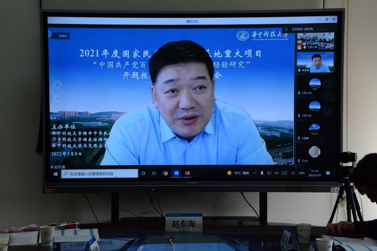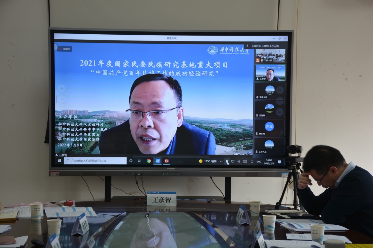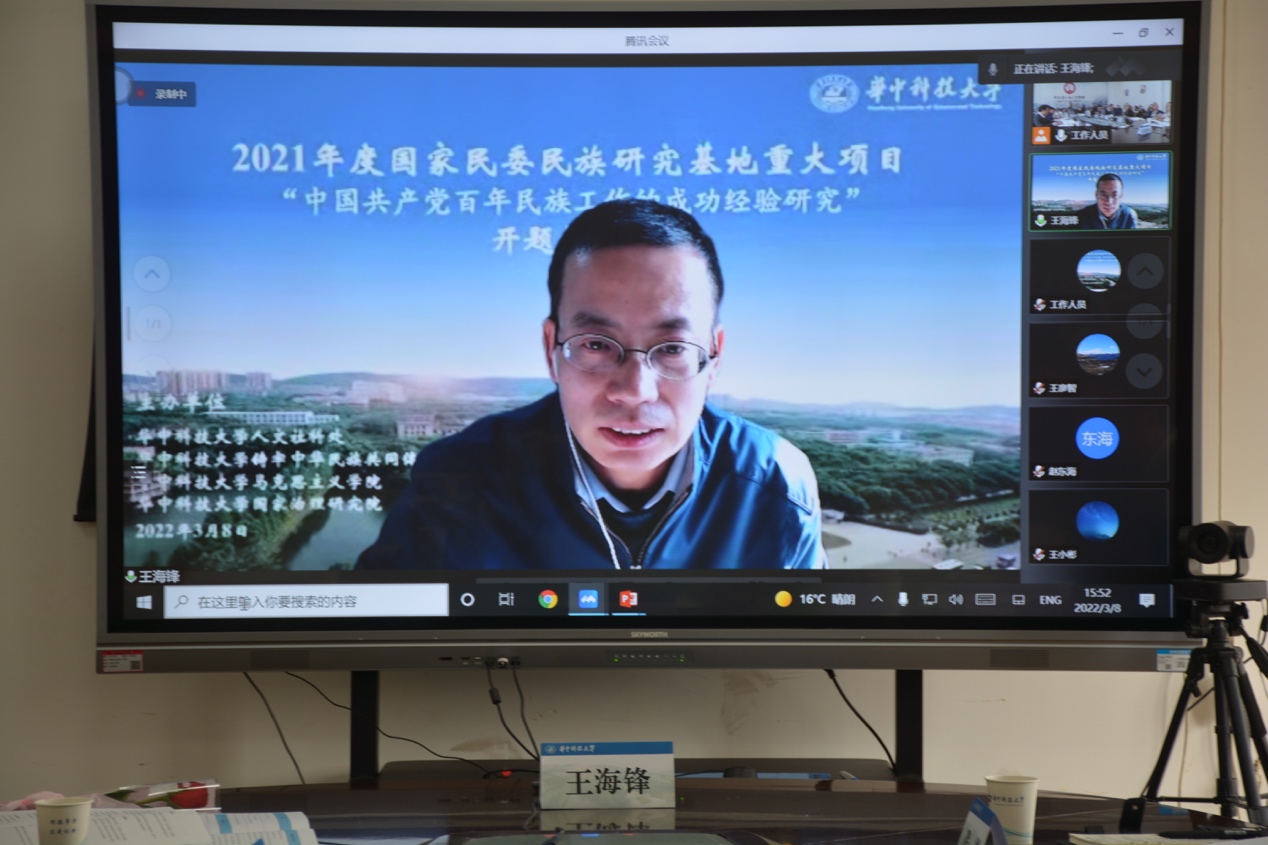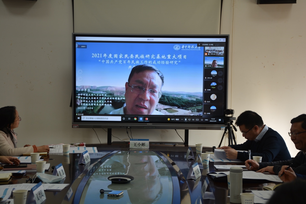 3月8日下午,由华中科技大学马克思主义学院马克思主义基本原理研究所、华中科技大学国家治理研究院、华中科技大学铸牢中华民族共同体意识研究基地承担的2021年度国家民委民族研究基地重大项目“中国共产党百年民族工作的成功经验研究”在华中科技大学东五楼会议室举行开题报告会。来自国家民族事务委员会协调推进司智库处、中共中央党校(国家行政学院)、中央民族大学、内蒙古民族大学、新疆大学、西藏民族大学等单位的专家参与此次会议。
