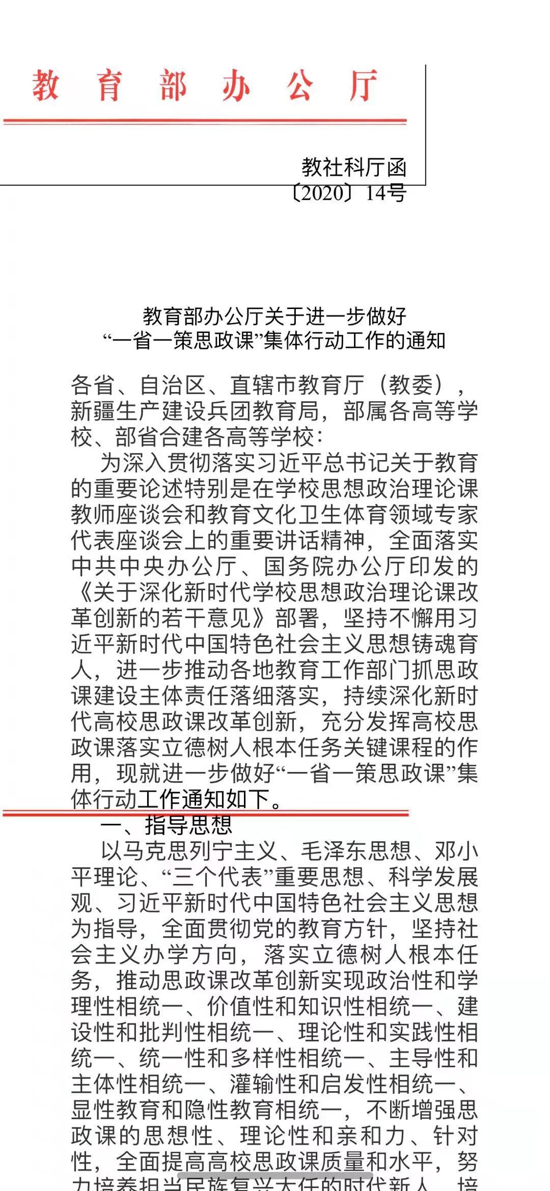 根据教社科厅函(2020)14号文件,教育部办公厅日前公布了新一轮的“一省一策思政课”集体行动。根据这个文件,我院长期提倡并参与的“中国系列”思政选修课再次入选,与上次第一轮有两点不同:其一,正式将类似“深度中国”的课程定位为“中国系列”思政选修课;其二,省内18家兄弟马院与我院一道参与建设。