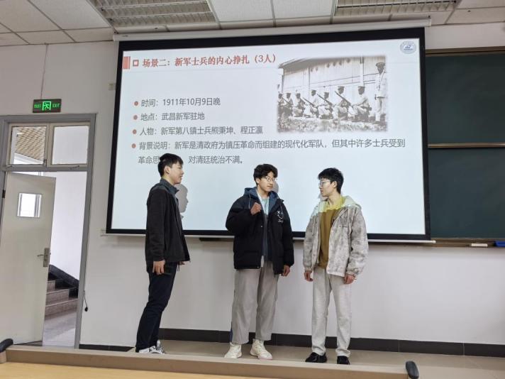 革命党人的秘密会议、新军士兵的内心挣扎、湖广总督瑞澂的犹豫、普通市民的恐慌与期望……情景剧《历史的抉择》中的四个场景生动地展现了不同人物在辛亥革命中的抉择与挣扎。“昨天老师在班级群里说有1分钟左右的角色扮演环节,我们小组立马就报名了。老师给我们提供的背景很简洁,本来只需要2个士兵的角色,我们小组一共6个人,大家一合计就增加了清廷官员训诫新军的场景,这个小的改编让矛盾更加突出,效果出乎意料的好。”生医2402班的刘鑫源同学分享了所在小组准备情景剧的过程,“而且老师鼓励我们进行创新,这种自由度让我们更有参与感,也让课堂更有活力。”