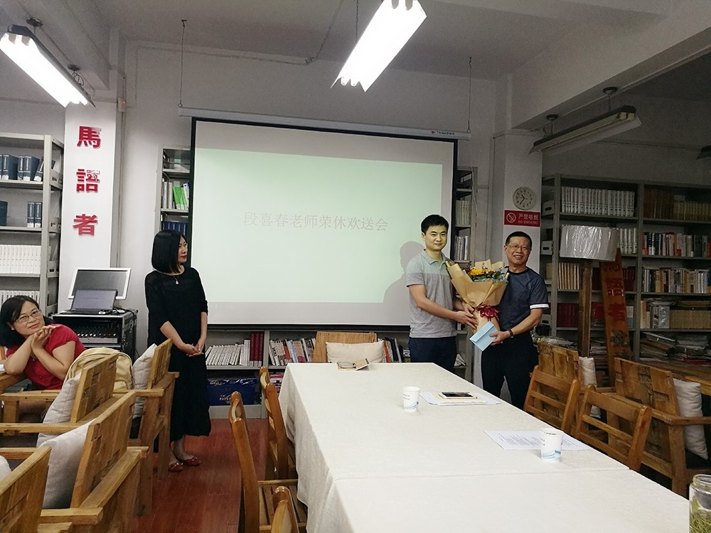 概论党支部举行了段喜春老师荣休会。新进教师沈孝鹏向段老师赠送纪念贺卡和鲜花,并表达了对段老师的感谢和祝福。党委书记胡艳华表达了对段喜春老师工作的肯定以及荣休的不舍,同时欢迎段老师继续以新的方式关注学院发展,并拥有一个健康快乐的退休生活。党支部其他成员也纷纷表达了对段老师的不舍与祝福。段老师回顾了自己的从教经历,以及与同事相处的点滴过往,对同事们表达了谢意,并希望学院发展越来越好。