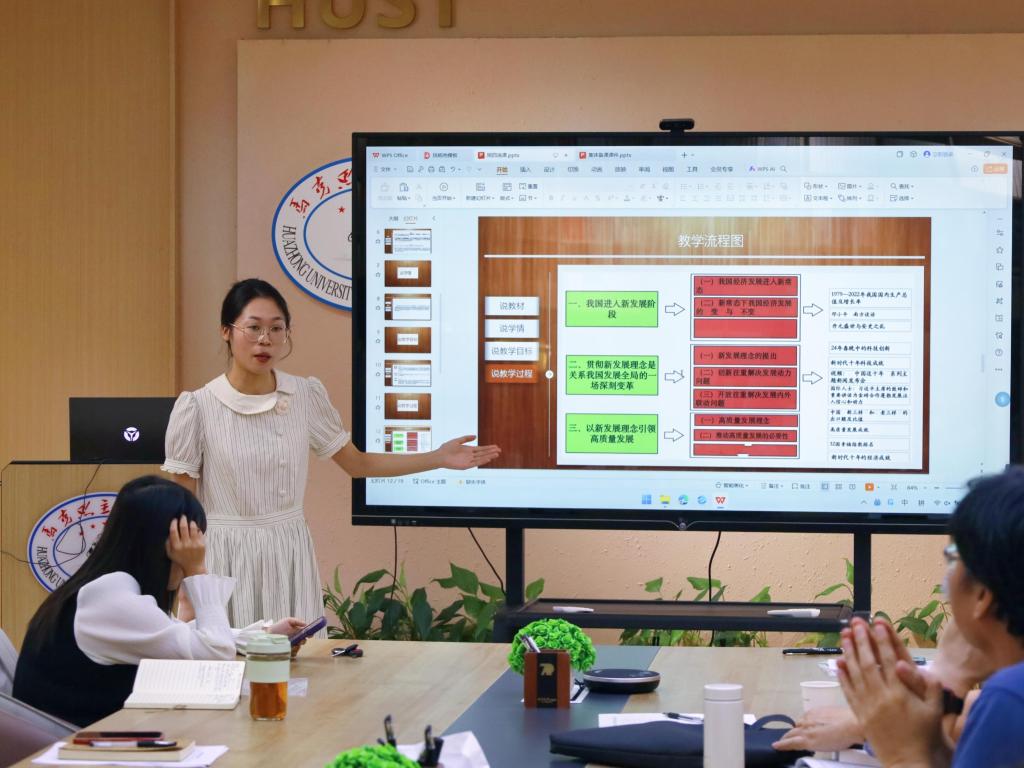随后,备课会进入青年教师说课环节。刘荣琴以推动高质量发展为主题展开说课,她从教材、学情、教学目标、教学过程四个方面分析了该节内容的教学重难点,并依此提出了具体应对措施,以便帮助学生深刻理解该节内容的理论意义及现实价值。