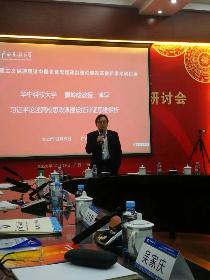 12月19日-20日,黄岭峻教授赴广西民族大学,参加由该校马克思主义学院举办的“马克思主义民族理论中国化暨思想政治理论课改革创新学术研讨会”。在会上,黄教授作了主旨发言,并于20日上午给该校马克思主义学院师生专门介绍了“深度中国”课程的建设经验,引起与会听众极大兴趣。该校马院李玉雄院长表示:将尽快研究策划,争取下学期在广西民族大学开出类似课程,并争取在最短时间内成为思政金课。