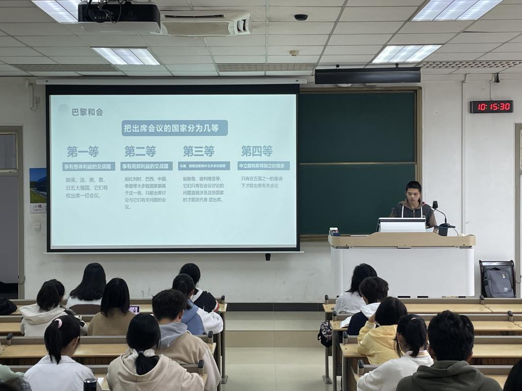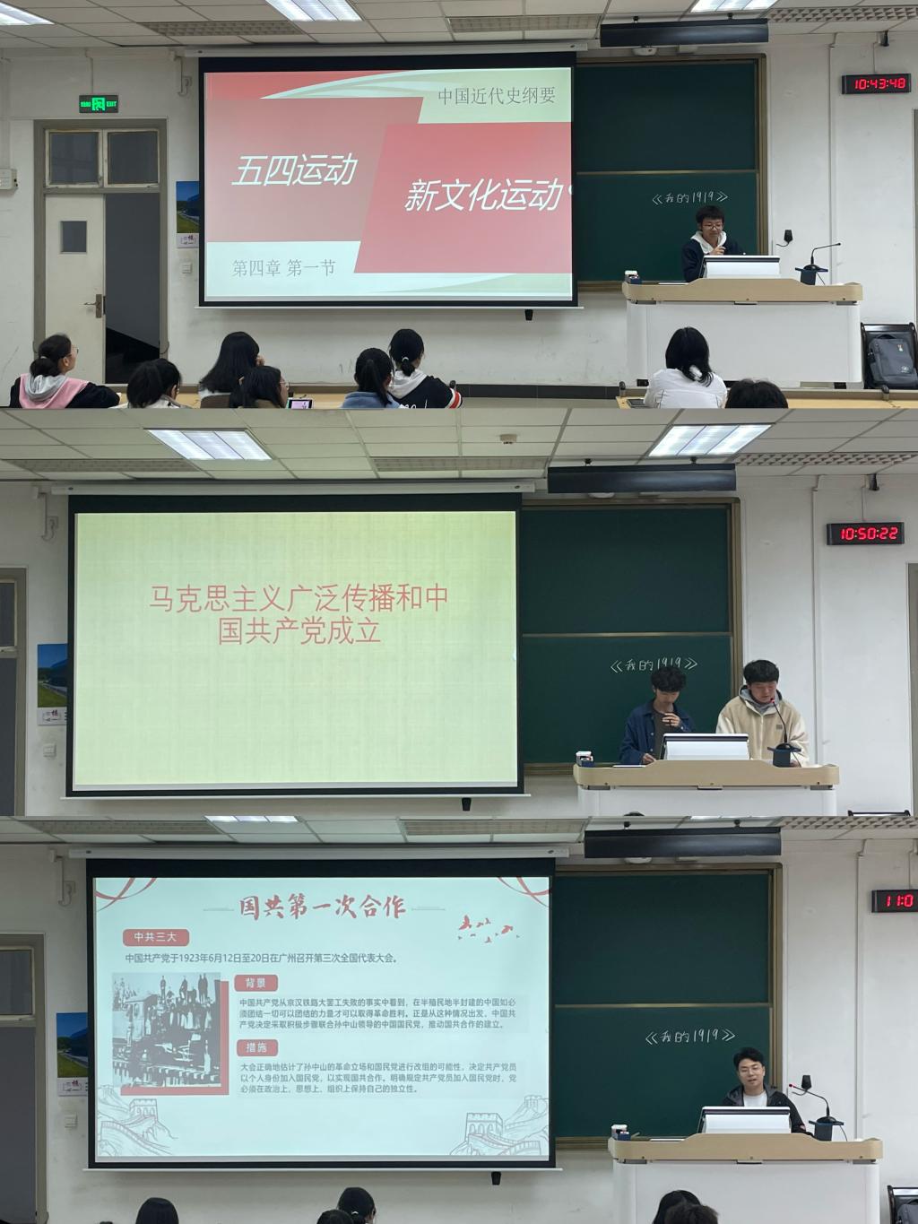 课前,李骏锋老师为首次参与“授课”的小组成员提供了相应指导,从时长、形式、内容、参考文献等方面设立了标准,“小翻转”不是“乱翻转”,一切要以教材为中心,内容是核心,同时更要彰显思政课的红色底色。在课堂上,各小组将新文化运动、五四运动的发展历程娓娓道来,并在此基础上详细讲述了马克思主义在中国的广泛传播与中国共产党的诞生。