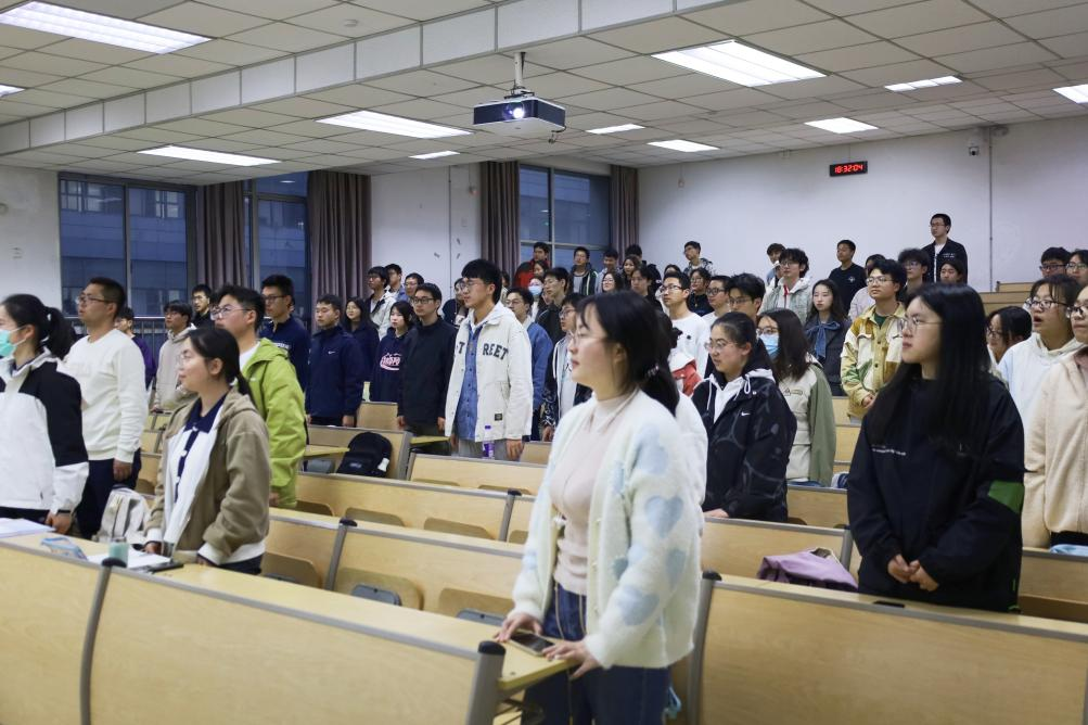 (通讯员:徐薇)“人民有信仰、国家有力量;目光所至,皆为华夏,五星闪耀,皆为信仰。”3月27日晚,华中科技大学东九教学楼C203教室传来了集体朗诵声。这是华中科技大学马克思主义学院开设的“四史”系列选修课程《百年中国》课。该课程的第三讲由马克思主义学院院长、教授岳奎主讲。课程开始前,岳教授都会带领学生进行宣誓式朗诵,意在通过这种形式让同学们深刻认识到自身肩负的历史使命与时代责任,引导大家树立“不负时代,不负韶华,不服党和人民的殷切期望”。