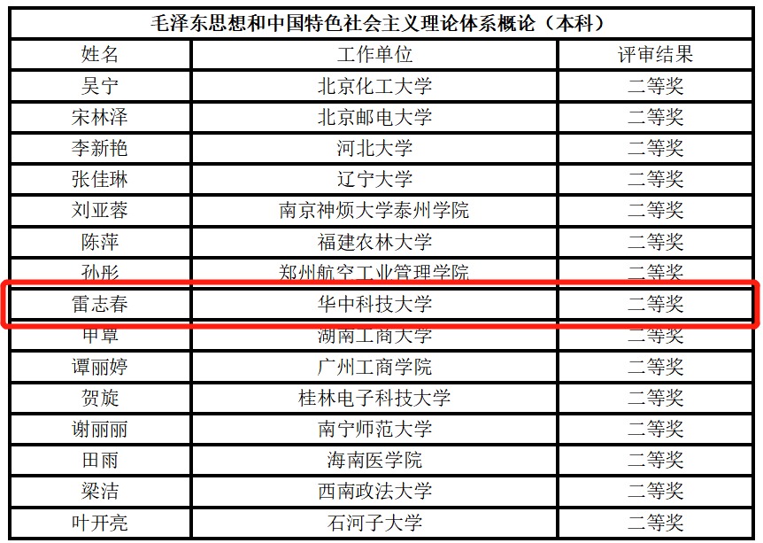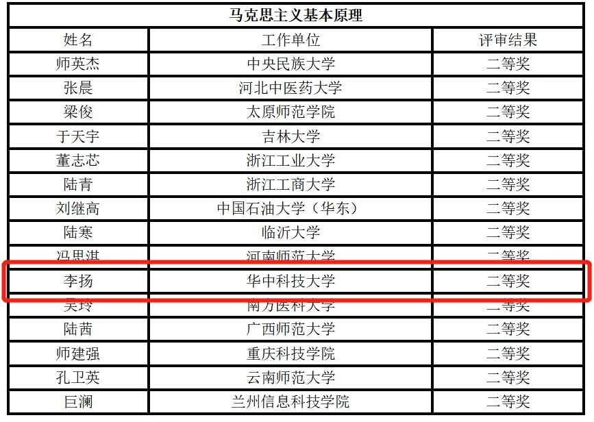 (通讯员:徐薇)近日,教育部公示第三届全国高校思想政治理论课教学展示活动“教学竞赛单元”评审结果。华中科技大学马克思主义学院教师李扬获“马克思主义基本原理”课二等奖,雷志春获“毛泽东思想和中国特色社会主义理论体系概论”(本科)课二等奖。