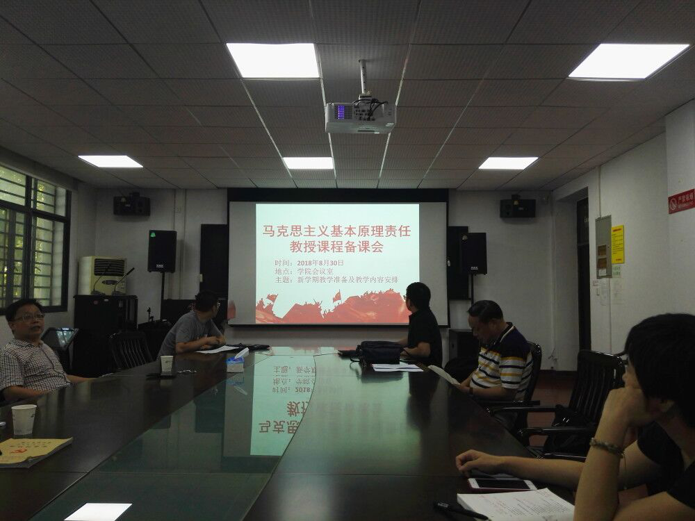 2018年8月30日上午,承担本学期《马克思主义基本原理概论》课教学的全体老师在学院大会议室进行第一次集体备课,会议由课程责任教授张峰主持,课程团队成员张峰、栗志刚、董慧、杨金华、吴兰丽、肖会平、杨成林、李扬、吕宏山、欧亚昆、赵建建共11位教师参加了此次讨论会。