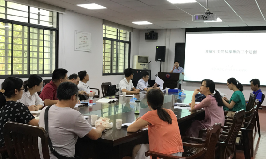 本次备课沙龙是本学期教研室第一次集体备课与理论学习活动,分为两个部分进行:第一部分由沈昊驹老师做专题报告“理解中美贸易摩擦的三个层面”,沈老师从经济遏制、技术遏制和全面遏制三个层面来解读了当前的中美贸易摩擦,并与现场师生就此问题展开了深入的交流与讨论。第二部门为教研室工作安排,具体部署了本学期“双周备课会”的形式与安排、确定了每期备课沙龙的专题报告人及初步选题、明确了针对2018版新教材的课件制备工作。虽然本学期未开设“概论课”,但教研室全体教师表示要提前准备,绝不松懈,借助集体备课的平台,加强对新版教材的理解,提升自身的教学能力与理论水平。