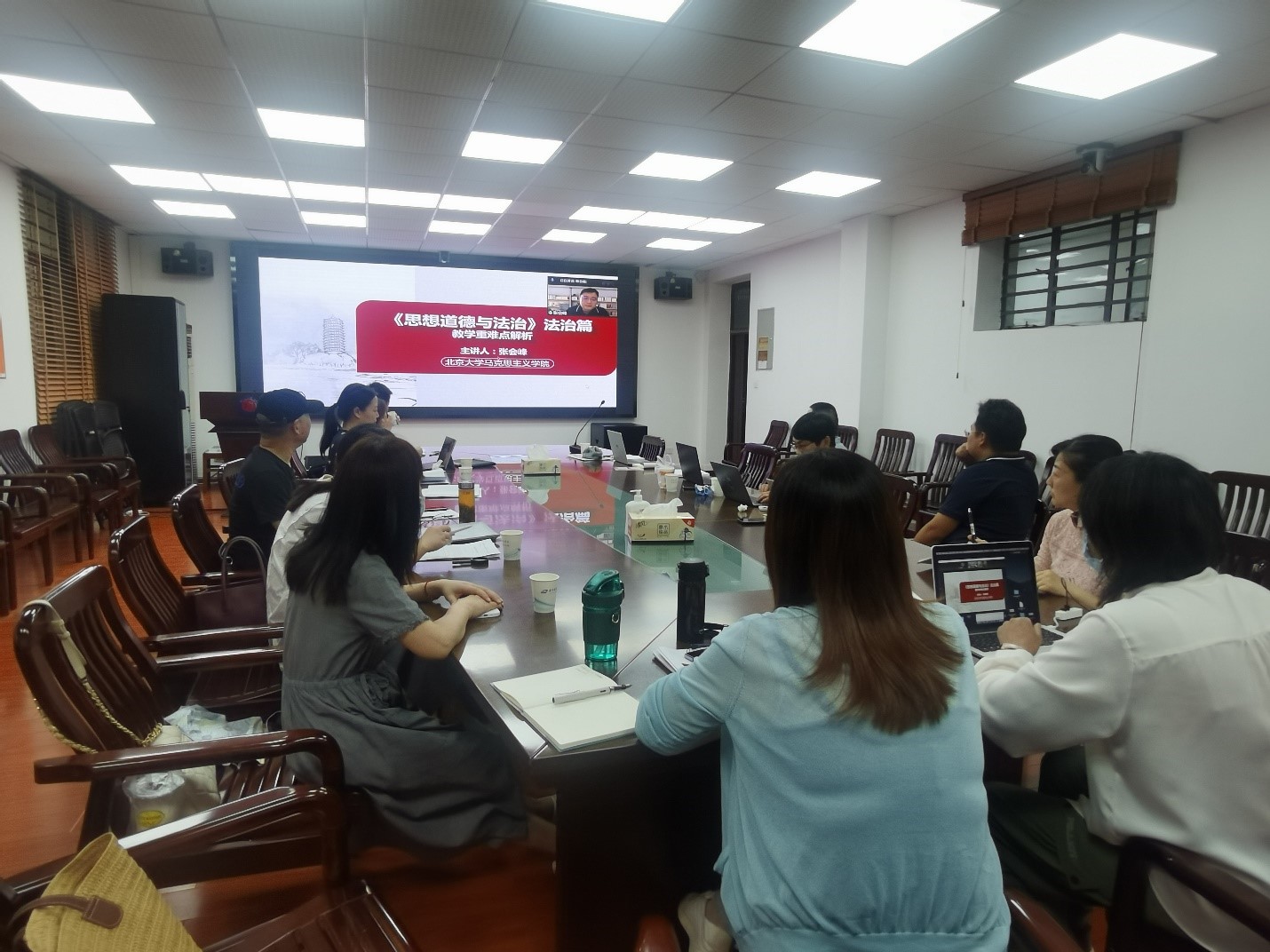 本次备课会主题是研讨“第六章 学习法治思想 提升法治素养”的教学要点与教学建议。首先,课程组特邀北京大学马克思主义学院张会峰老师导学第六章,张老师通过对比两版教材法治篇的内容结构,指出新教材新增加了全面依法治国的根本遵循、宪法实施与监督、不断提升法治素养等内容。关于教学,张老师提出可以将德法关系作为从道德篇向法律篇过渡的知识衔接,接着他重点梳理了每一节的教学要点,强调法律教育要帮助学生从了解法律到理解法治,从认知到认同,从问题到主义的升华,且需要一定的知识为基础,所以在课时和条件允许的情况下可以适当补充和拓展。张老师强调,马克思主义法学教育是介于问题与主义之间的教育,在教学案例的选择时要有指导性。与会老师们就案例的选择与使用问题与张老师进行了讨论,纷纷表示在聆听张老师导学之后,对于第六章教学重难点更加明确,对于第六章由教材体系向教学体系过渡更加有办法、有底气。