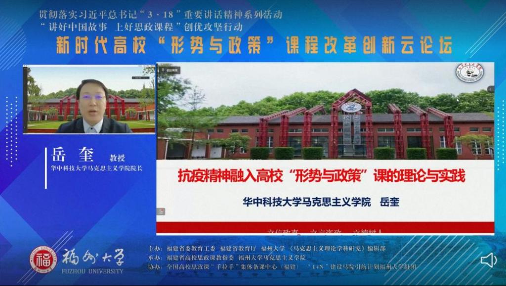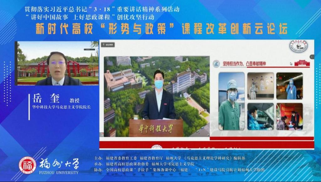 3月19日,由福建省高校思政课教指委与福州大学马克思主义学院联合承办的新时代高校“形势与政策”课程改革创新云论坛在线上举行,来自全国不同高校近12000名思政课教师及学生线上参会。我院岳奎教授应邀参会并做题为“抗疫精神融入高校‘形势与政策’课程的理论与实践”的主题报告。