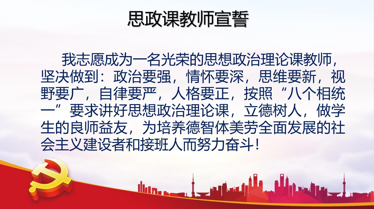 大会结束后,新一届党委组织与会全体思想政治理论课教师庄严宣誓:“我志愿成为一名光荣的思想政治理论课教师,坚决做到:政治要强,情怀要深,思维要新,视野要广,自律要严,人格要正,按照“八个相统一”要求讲好思想政治理论课,立德树人,做学生的良师益友,为培养德智体美劳全面发展的社会主义建设者和接班人而努力奋斗。”宣誓教师纷纷表示,宣誓是向党组织一生的庄严承诺,也是作为人民教师一生践行的诺言。