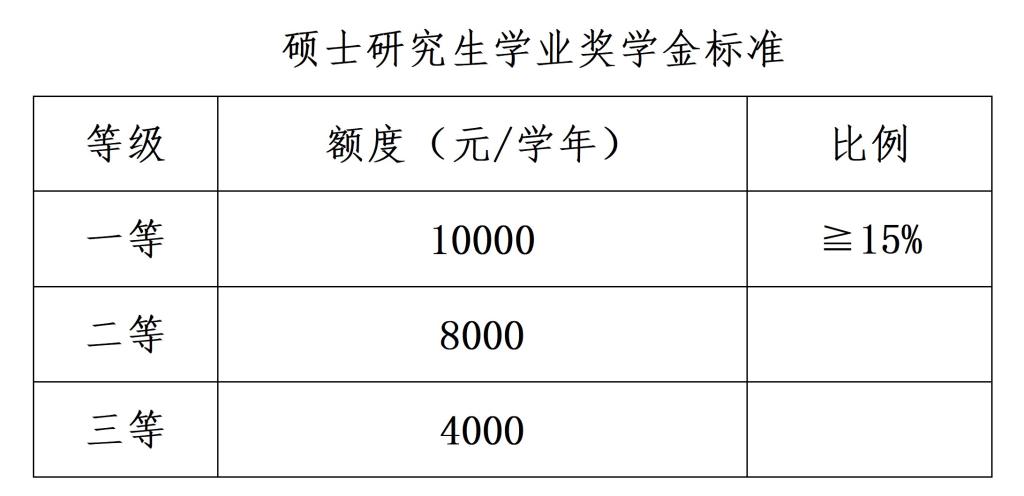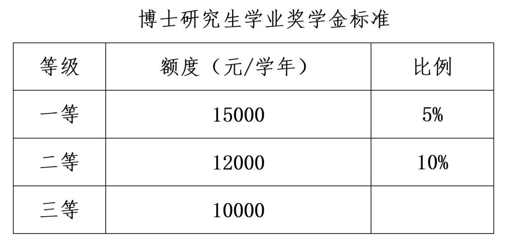 (一)博士学业奖学金,奖励标准为:一等学业奖学金15000元/年/生,二等学业奖学金12000元/年/生,三等学业奖学金10000元/年/生。
