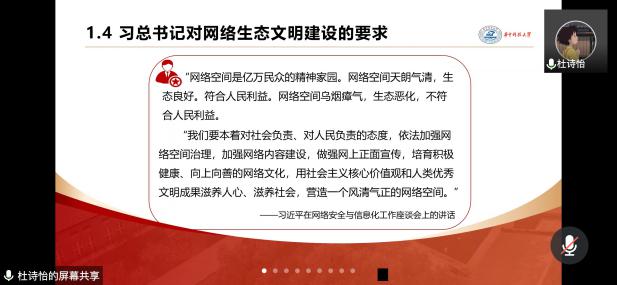 在微党课环节中,杜诗怡同志以《同塑网络生态,共建网络文明》为题为大家带来了一堂内容充实而又深刻的微党课。她首先以十九届五中全会对网络生态文明建设的要求谈道“加强网络文明建设,发展积极健康的网络文化”建设具有中国特色的网络文明是我们面临的重要任务;此外,她以发生在我们身边的、真实的事件、社会热点话题——近几个月一些院系学生的网络受骗事件、“清华学姐”事件等为案例,告诫青年党员要学会分辨海量信息,树立高度的网络安全意识,文明上网,理性发声;最后,强调作为时代先锋,我们应争做网络新青年,共筑网络新生态。