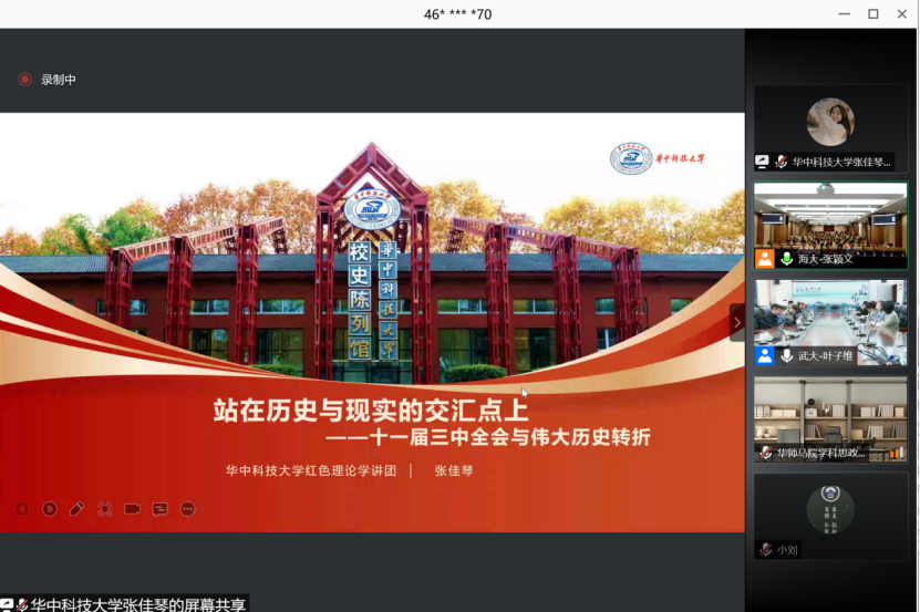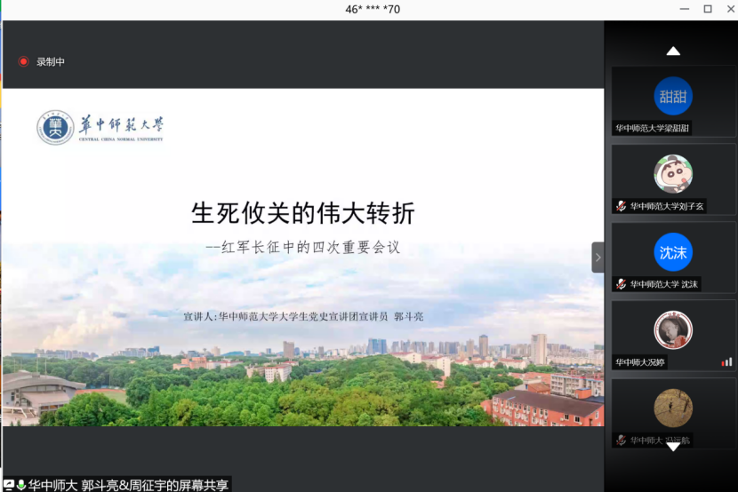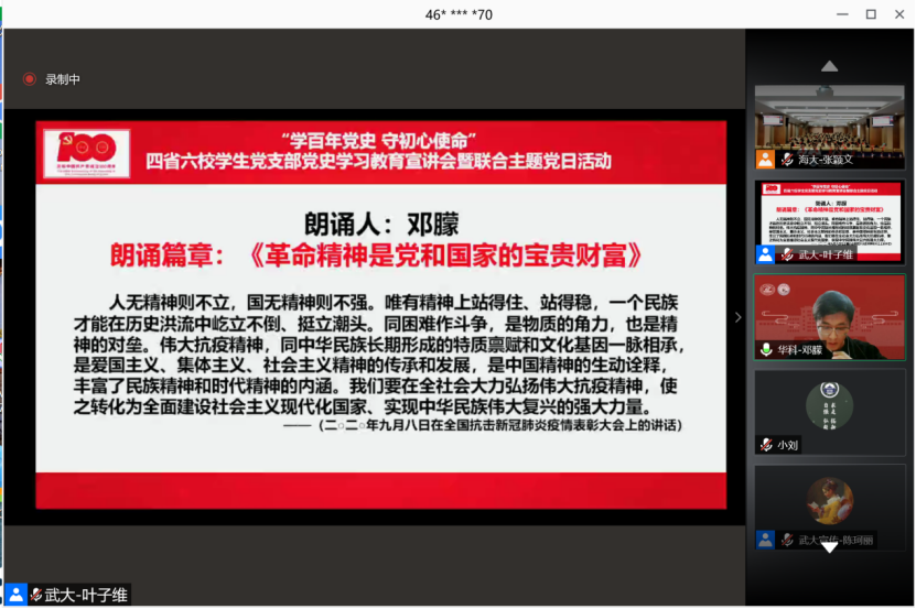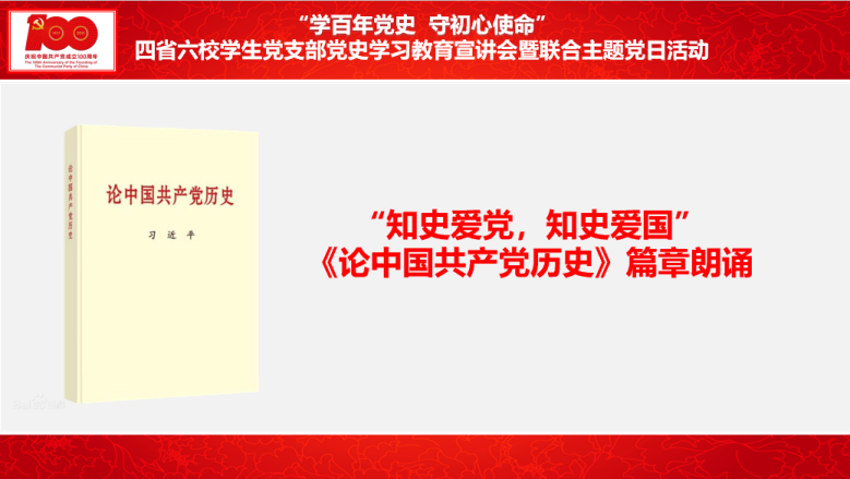 《论中国共产党历史》一书,是全党全社会深入学习习近平新时代中国特色社会主义思想、学习中国共产党历史的权威教材。接着,来自六校的9名学生党员以线上接力的方式朗诵了习近平《论中国共产党历史》中《知史爱党、知史爱国》《革命精神是党和国家的宝贵精神财富》等篇章。在篇章朗诵中领悟党的初心和使命,更加坚定对党的信心信赖、对马克思主义和社会主义的信仰信念、汲取奋斗前行的思想智慧和精神力量。