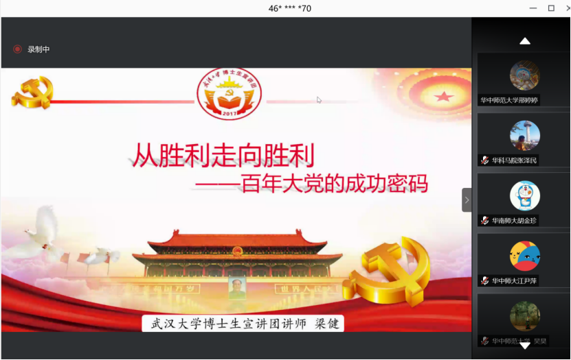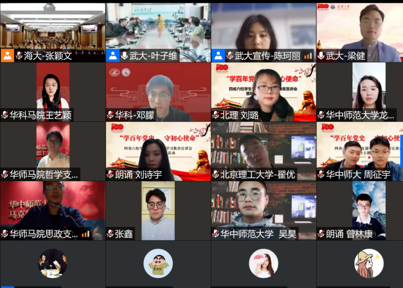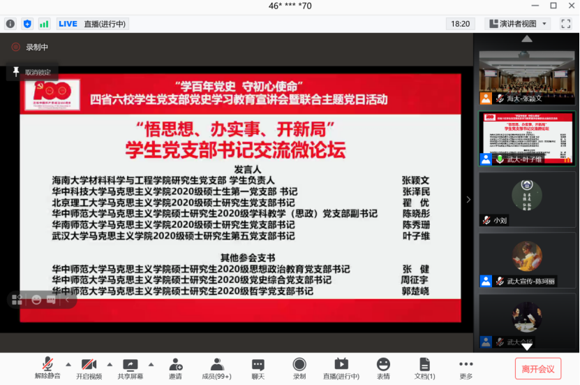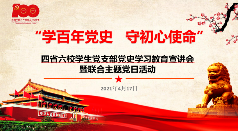 百年征程波澜壮阔、百年初心历久弥坚、百年大党风华正茂。今年是中国共产党建党100周年。习近平总书记在党史学习教育动员大会上指出,中国共产党的一百年是矢志践行初心使命的一百年,庆祝中国共产党百年华诞,是全党政治生活中的一件大事。为深入贯彻落实习近平总书记在党史学习教育动员大会上的重要讲话精神,深化“不忘初心,牢记使命”主题教育成果,引导广大青年学生党员传承红色基因,砥砺政治品格,筑牢信仰之基,以实际行动庆祝建党一百周年。2021年4月17日下午,我院硕士生第一党支部全体学生线上参加由武汉大学、海南大学联合华中科技大学、华中师范大学、北京理工大学、华南师范大学六校学生党支部以线上线下相结合的方式开展了以“学百年党史、守初心使命”为主题的党史学习教育宣讲会暨联合主题党日活动。武汉大学党委研究生工作部副部长左征军、海南大学研究生处(研究生工作部)副处长郑育声、武汉大学马克思主义学院党委副书记秦后国、海南大学材料科学与工程学院党委副书记周郭军出席活动,来自四省六校十一个支部的300余名学生党员参加了此次活动。活动由海南大学材料科学与工程学院党委副书记周郭军主持。