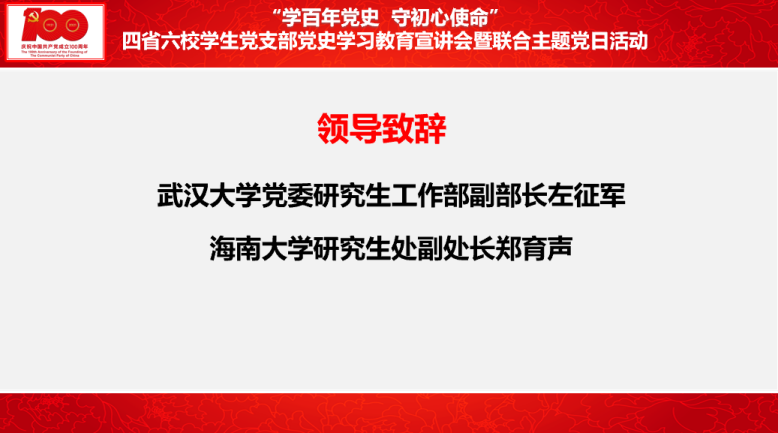 活动伊始,武汉大学党委研究生工作部副部长左征军、海南大学研究生处(研究生工作部)副处长郑育声分别做致辞。左征军副部长在致辞中首先向与会师生介绍了武汉大学博士生宣讲团的基本情况。他指出,此次联合活动既是一个交流学习的机会,也是一个互促互进的平台,希望大家借此机会相互交流、相互借鉴,共同提高、共同进步,希望大家以此平台创新党史宣讲形式,提升宣讲质量,推动党的创新理论在广大青年中入脑入心、见行见效、落地落实。郑育声副处长表示,开展党史学习教育,是党中央的重大决策部署,此次联合主题党日活动牢牢把握住了总书记讲话中对全党开展党史学习教育提出的工作要求,真正做到了立足实际和守正创新。她向与会师生党员分享了三点党史学习的体会:一是要牢固树立正确的党史观,运用历史唯物主义的方法科学认识和评价党的历史;二是要掌握党史学习的科学方法,在书本和现实、理论与实践的互动中了解党的百年历史和奋斗新征程。三是要在党史学习中汲取前进力量,将党史中蕴藏的精神养分融化为指引前进方向的红色基因、转化为投身社会主义现代化建设的青春动力。