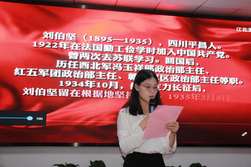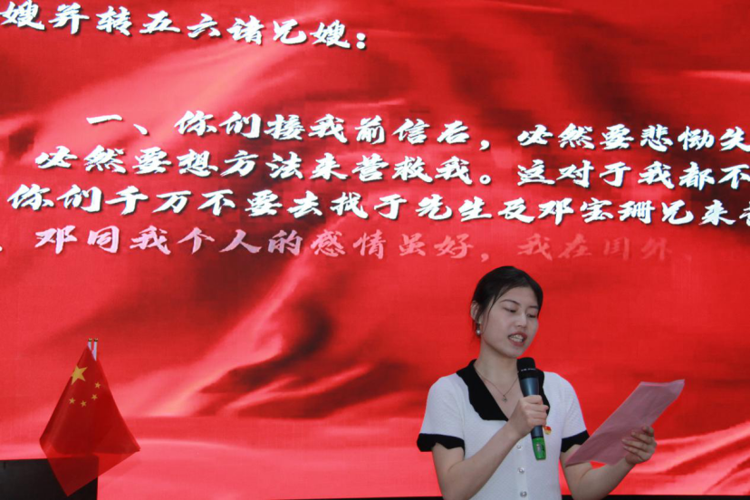 随后,赵晶莹、王文乐同学以饱含深情的声音诵读了刘伯坚的家书《生是为中国,死是为中国》。“你不要伤心,望你无论如何要为中国革命努力,不要脱离革命战线,并要用尽一切的力量教养虎、豹、熊三幼儿成人,继续我的光荣事业。”刘伯坚用短暂的一生捍卫着自己的诺言,他无私无畏的革命精神、对理想信念的坚守,都体现这封绝命书的字里行间,这是他用生命和信念吟成的诗歌,闪烁着铁骨铮铮,顶天立地英雄的光辉。