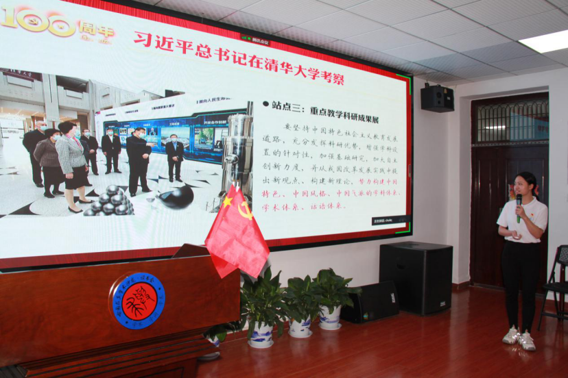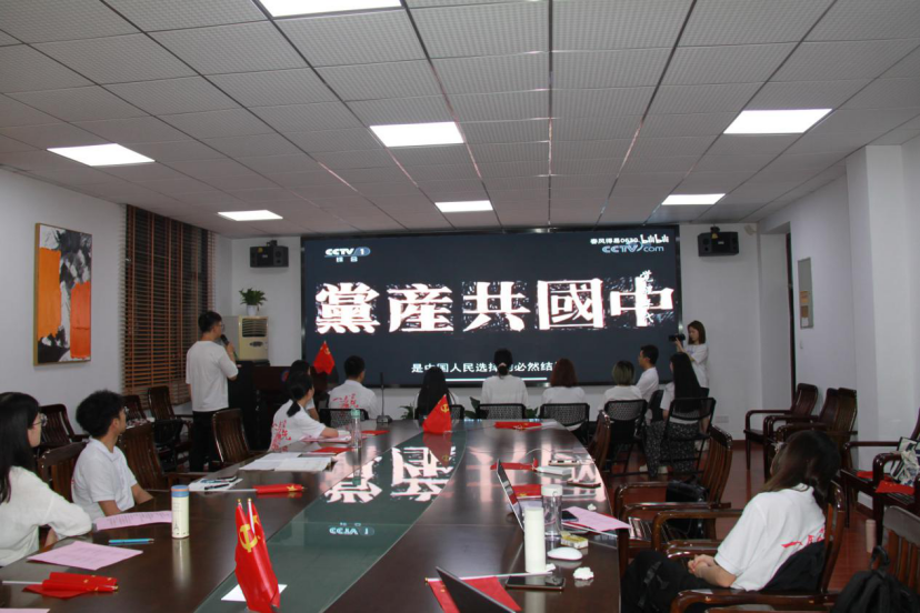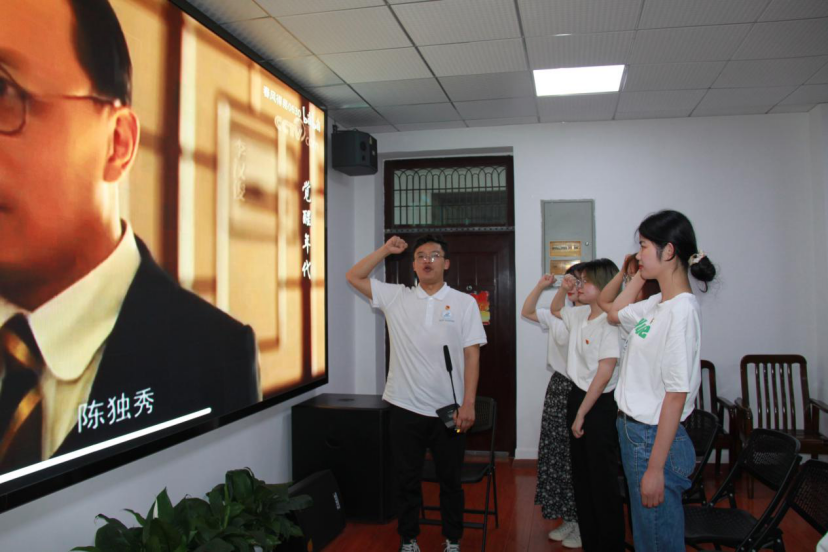 “同志们,从现在起,我们几个就是中国共产党的第一批成员了,从今天起,中国的工人阶级就有了自己的先锋队组织,我们的名字叫中国共产党员!”伴随着紧促厚重的音乐声,支部成员张军、何思明、席焕焕等9名同学以影视配音的方式演绎了1920年8月中国共产党第一个早期组织在上海成立的场景,带领与会成员共同重温中国共产党诞生这一开天辟地的大事件,感受早期革命先辈们义无反顾肩负起实现中华民族伟大复兴重任的家国情怀。