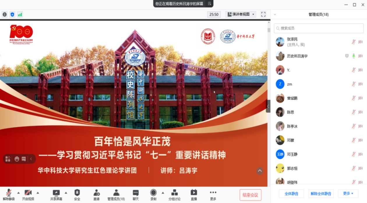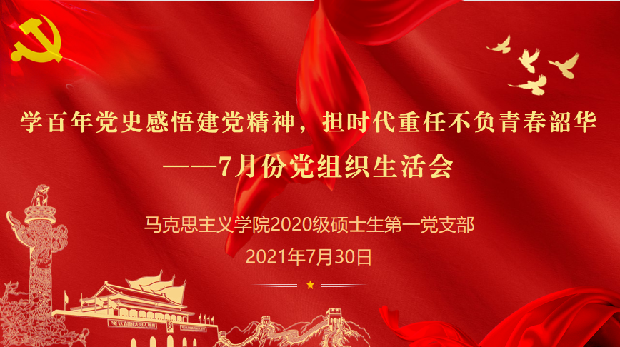 7月30日晚,我院20级硕士生第一党支部开展了主题为“学百年党史感悟建党精神,担时代重任不负青春韶华”七月线上主题党日活动,本次主题党日活动由支部书记张泽民主持,分散在全国多地正在进行实习实践的支部成员们齐聚在一起,共同回顾中国共产党成立100周年庆祝大会,体会百年荣光,熠熠生辉;聚焦习近平总书记重要讲话精神,学习中国共产党人的精神谱系;以踔厉奋发,踵事增华的新姿态,交流学习感悟和实习实践心得体会。